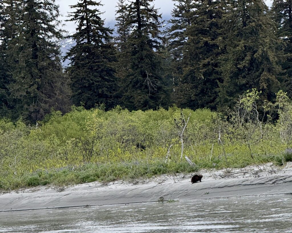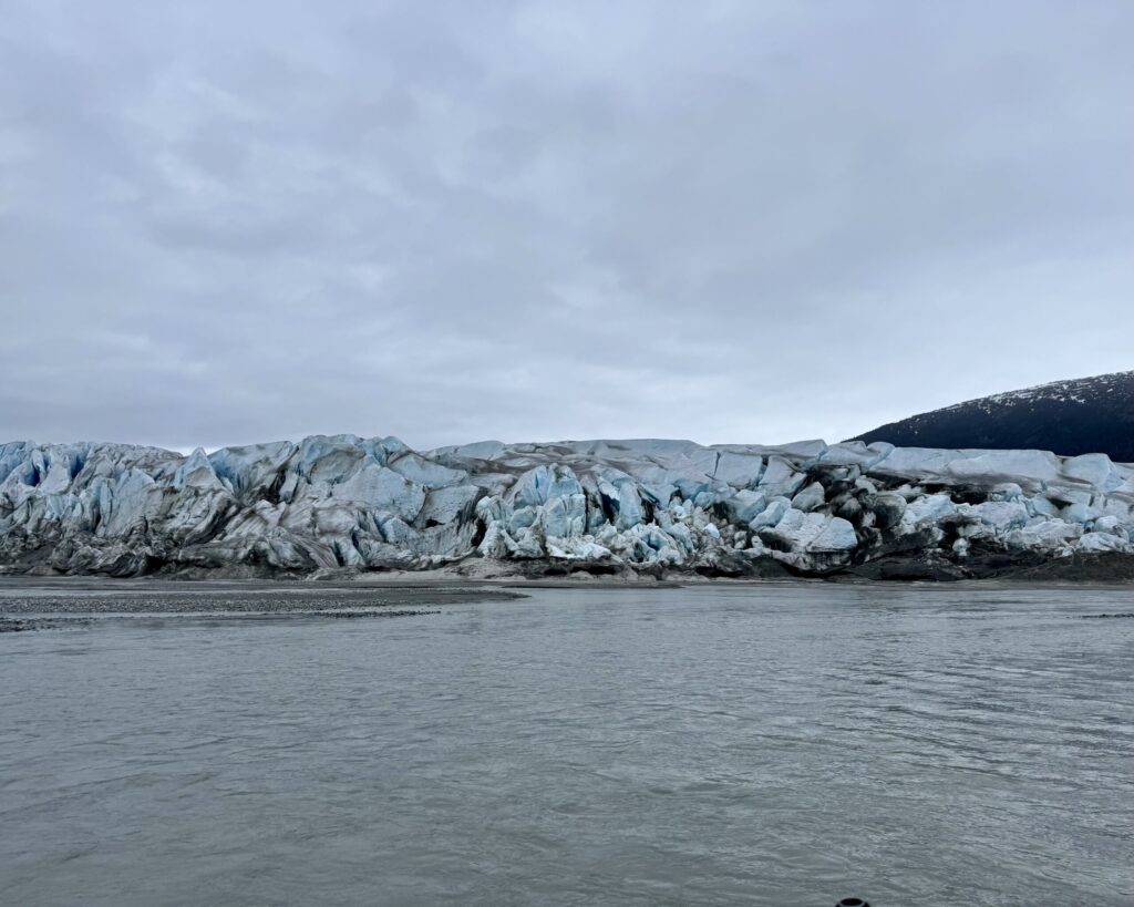 You’ve already zipped around the river below on a giggle-inducingly exhilarating air boat ride to see where Taku’s ice meets its final phase change. You got to sit high up next to the giant fan by the captain; with the chill wind whipping at your face and the boat careening around wildly to avoid half sunken trees and fields of accumulated silt and gravel bars, you laughed until tears ran down your face. You saw alpine waterfalls and enormous beavers and eagle’s nests in a green, early summer landscape on one side, and a rainbow of every blue that could possibly exist in the world on the other. Solidly compacted ice with no air left within it absorbs every wavelength longer than those short blues, which fade to white when air is introduced and all the wavelengths and their corresponding colors are refracted. Between this monochrome palate and the gray-brown silt, every sharp break as the ice crumbles from boulder to pebble is emphasized, leaving a dramatic image of icy decay. It was like flying along the precise dividing line between the depths of cold, dead winter and the warmth and life of summer, as if Stormy reigned on one side and Rainbow Brite the other.*