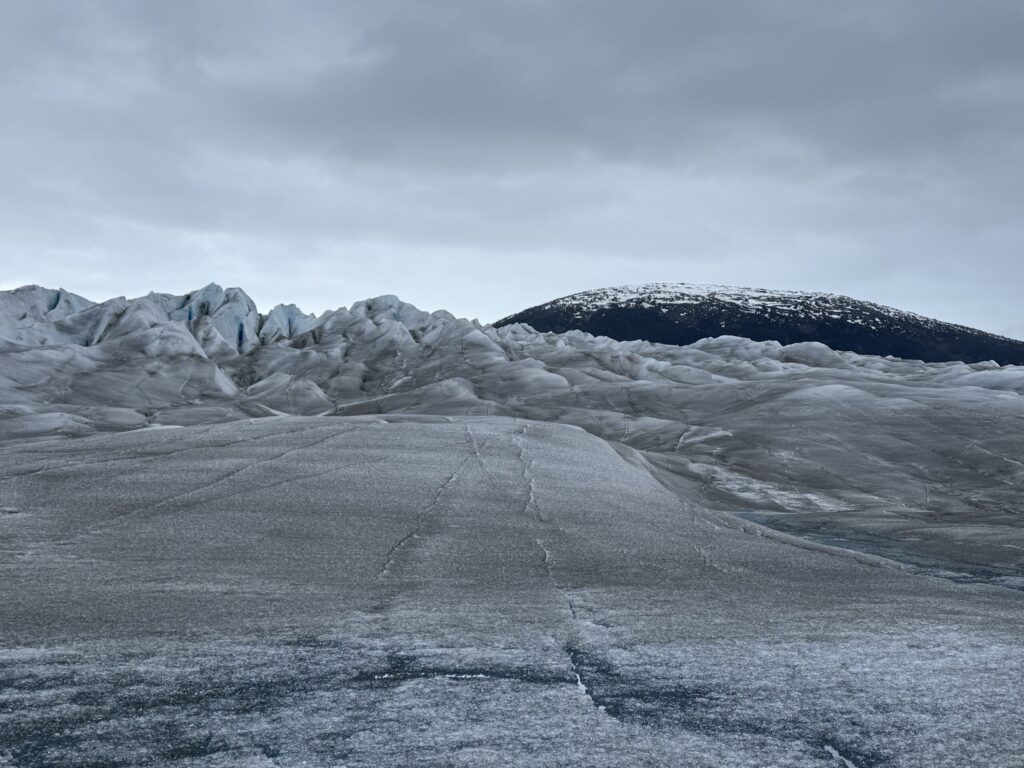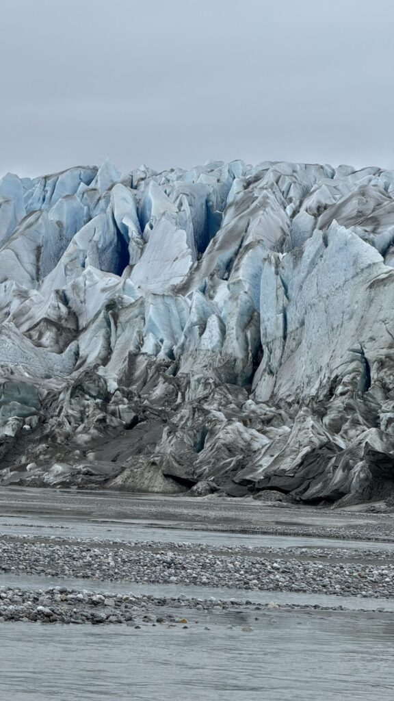 The sight that greats you as you step out onto stolid ground is surprising as well. One might expect a glassy expanse of blues and whites, conveniently dusted with a powdery coating of fresh fallen snow for sure footing – but one might be taken aback by the reality if so. You step down from your Pegasus with a gravely crunch, onto a surface more akin to a damp beach or those playgrounds of the 90s laid over with miniscule, polished rocks. While generally flat in the immediate vicinity, the glacier is far from smooth, a craggy, clumpy mess of slushy icy crystals. And it’s so dirty! Everything is dusted not by fine particles of white, but by a pebbled coating of greyish brown silt that has been scrapped from the land as the frozen river flowed.
