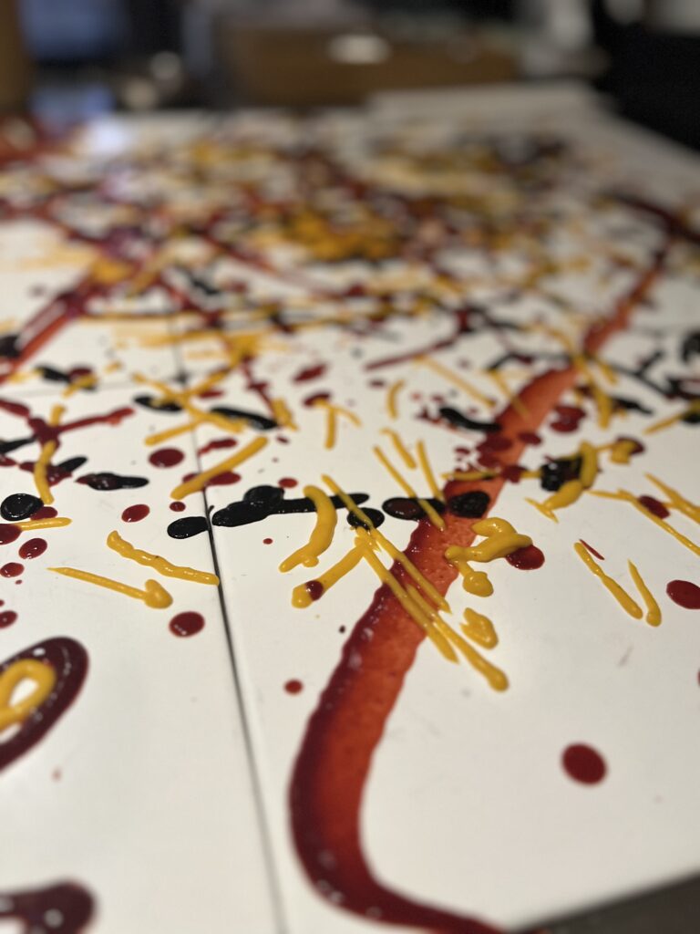 On my first visit, the theme seemed to be art and color. When I arrived, there was a time to mingle about and explore the hors devours, have a mocktail, settle in. There was a color wheel that you spun to determine what kind of coating your foie gras lollypop was dipped into; a Monochromatic bite consisting of only red ingredients (and laid out on a deep red table); a Jackson Pollock event where we were given squeeze bottles of three sauces and a canvas made of square plates, and encouraged to go nuts. I may have gone a little too nuts though, as I def squirted another diner a tiny bit in the face. She was not amused, but I think she just wasn’t in the spirit. I mean, it wasn’t much, and it was on her cheek for god’s sake! I didn’t even hit her in the eye or anything! But I digress… After we sat, the theme continued with dishes like the Texture and Contrast (creamy white parmesan, chewy, earthy shiitake, crisp tater tot) and the Print Making (sauces stenciled onto plates to create a beautiful canvas for pork belly). Was the meal perfect? Absolutely not. The mocktails were all too sweet, the chicken was a bit dry – but what I remember was a wonderful meal that was also entertainment, a meal that delighted all of my senses, a meal that was fun.