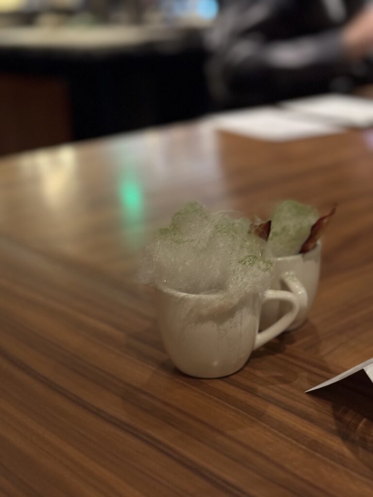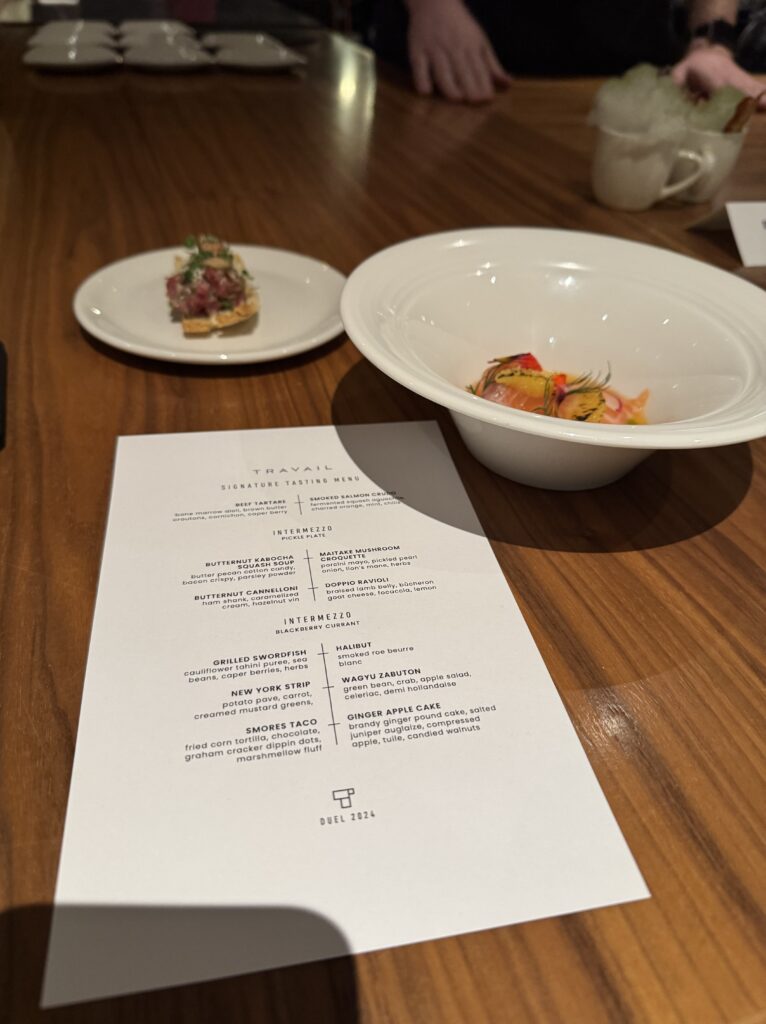I’ve eaten at Travail twice since moving to the Twin Cities in 2022, and while both meals were playful and fun, they were very different experiences. I suspect that not only does the menu change often at this tasting-menu venue, but also the whole concept of the meal! Between that and the attitude of the staff when I’ve visited, I imagine a lively group of them sitting down together, eating of course (you always eat during restaurant planning sessions, in my experience), devising a whole new theatrical concept for the meal in the coming term, then the designing the menu around that idea or theme. This image I’ve created of the inner workings of Travail as this silly, happy place where they’re really just playing… it almost makes me want to go back to kitchen work (but then I get the almost PTSD reaction that always comes with that thought, and I move on).