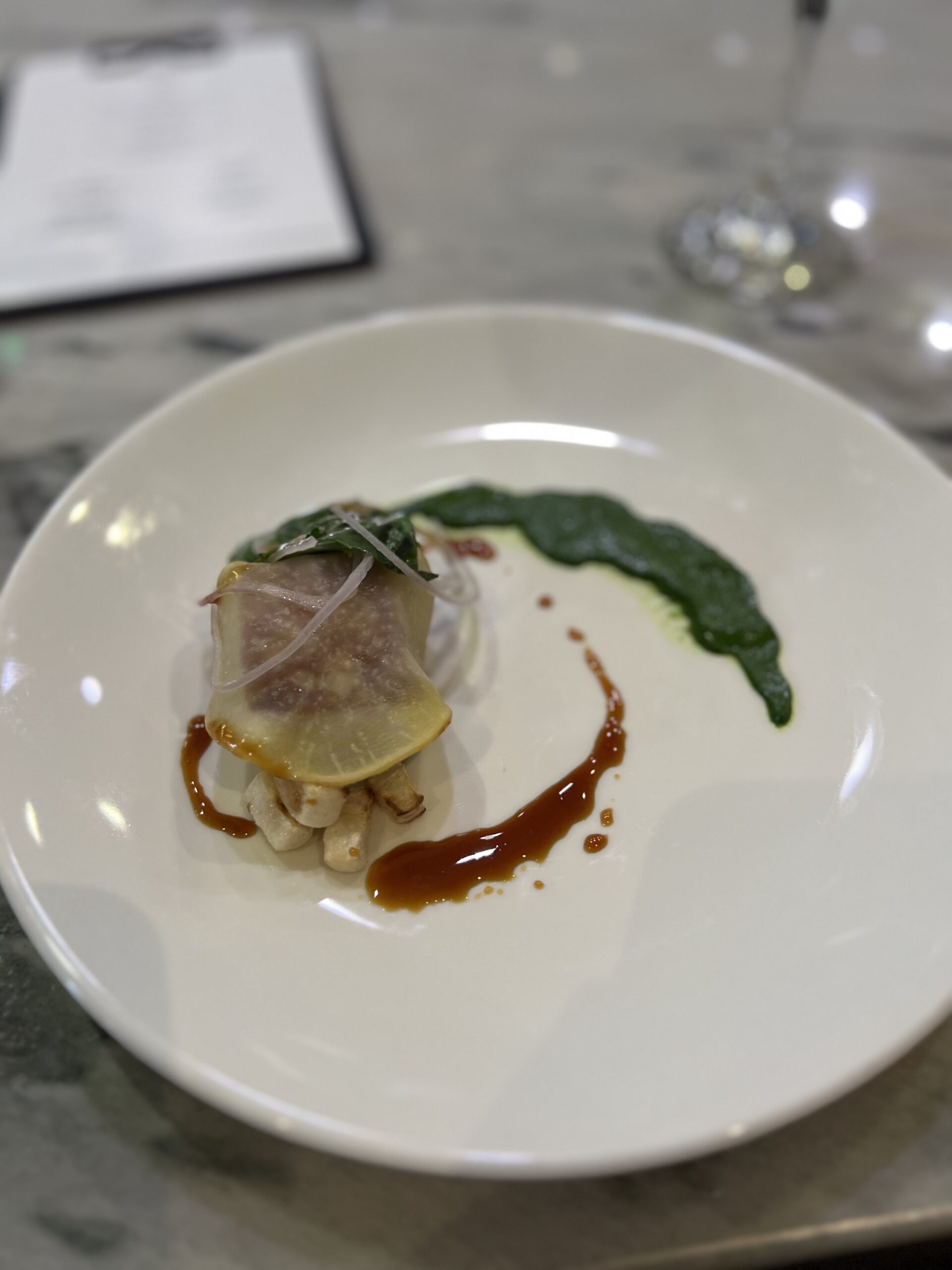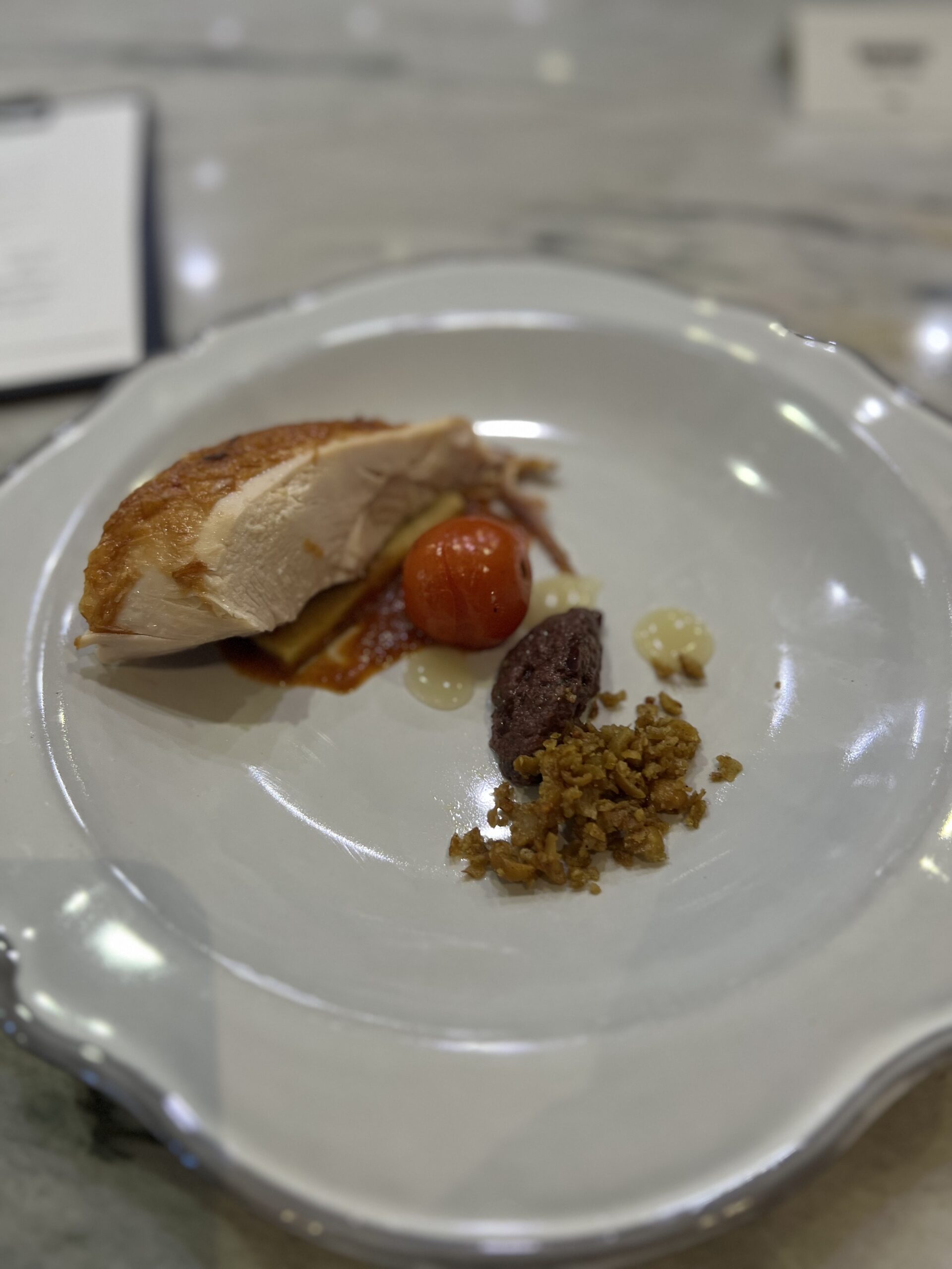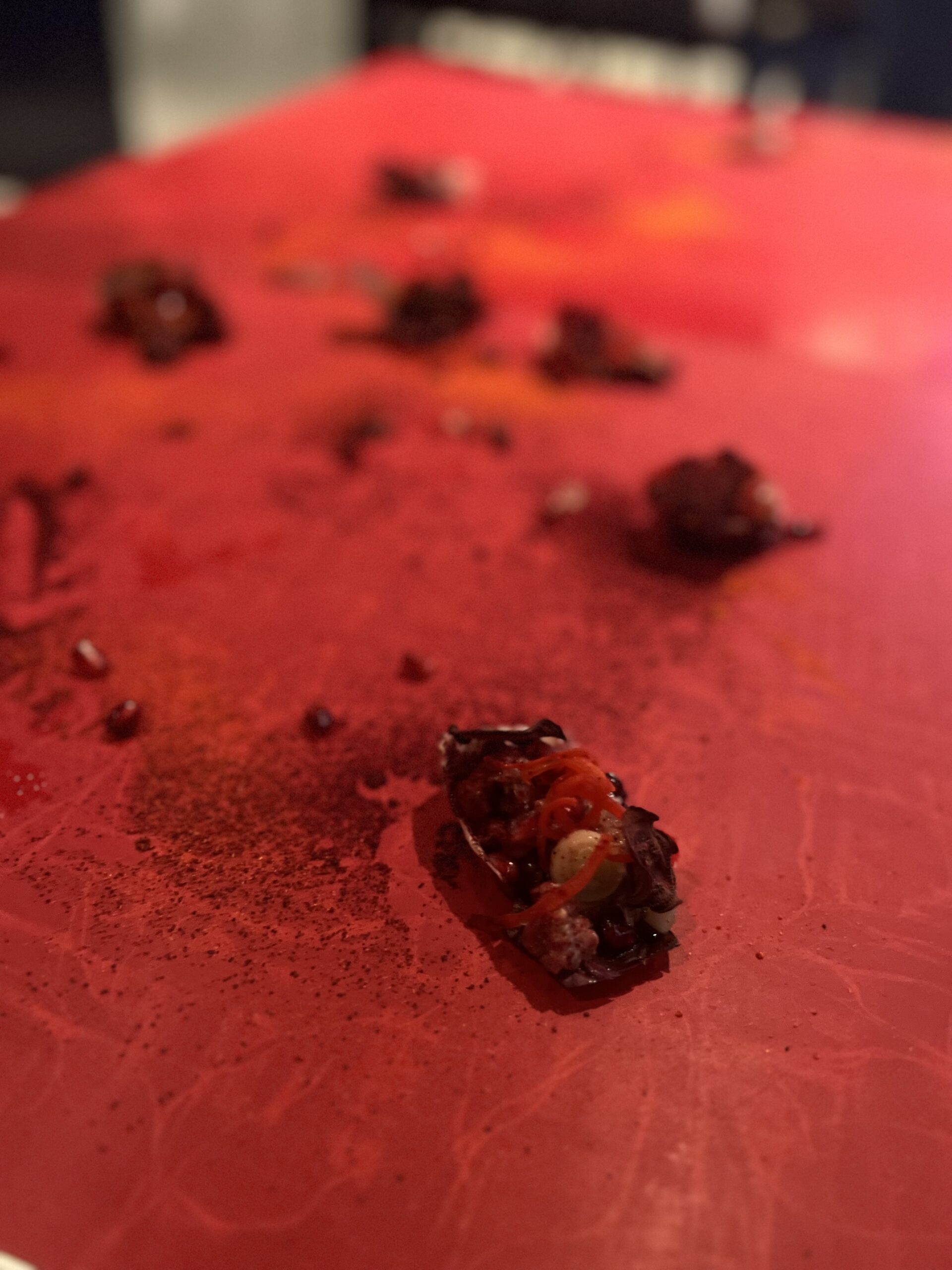 On my first visit, the theme seemed to be art and color. When I arrived, there was a time to mingle about and explore the hors devours, have a mocktail, settle in. There was a color wheel that you spun to determine what kind of coating your foie gras lollypop was dipped into; a Monochromatic bite consisting of only red ingredients (and laid out on a deep red table); a Jackson Pollock event where we were given squeeze bottles of three sauces and a canvas made of square plates, and encouraged to go nuts. I may have gone a little too nuts though, as I def squirted another diner a tiny bit in the face. She was not amused, but I think she just wasn’t in the spirit. I mean, it wasn’t much, and it was on her cheek for god’s sake! I didn’t even hit her in the eye or anything! But I digress… After we sat, the theme continued with dishes like the Texture and Contrast (creamy white parmesan, chewy, earthy shiitake, crisp tater tot) and the Print Making (sauces stenciled onto plates to create a beautiful canvas for pork belly). Was the meal perfect? Absolutely not. The mocktails were all too sweet, the chicken was a bit dry – but what I remember was a wonderful meal that was also entertainment, a meal that delighted all of my senses, a meal that was fun.