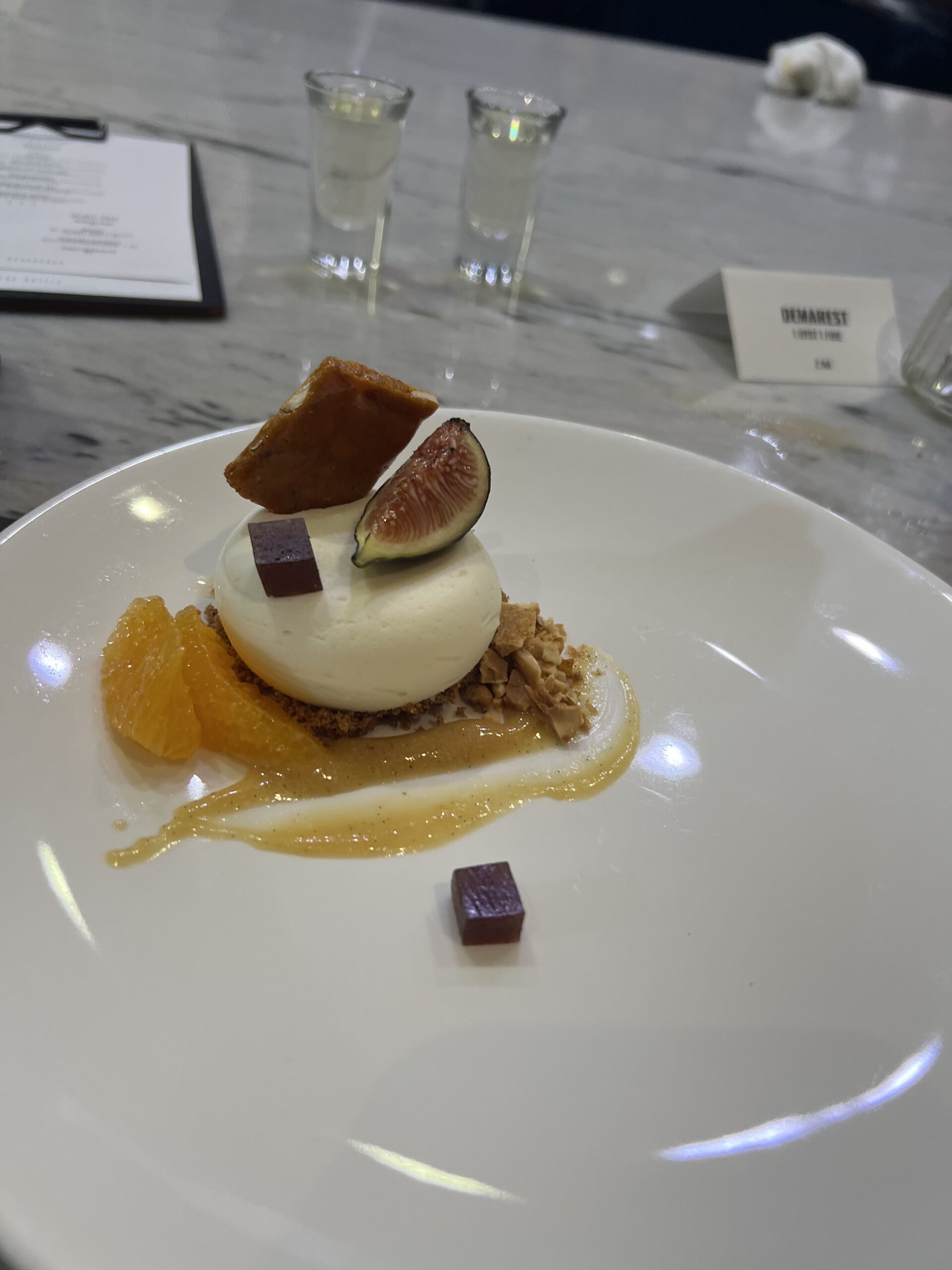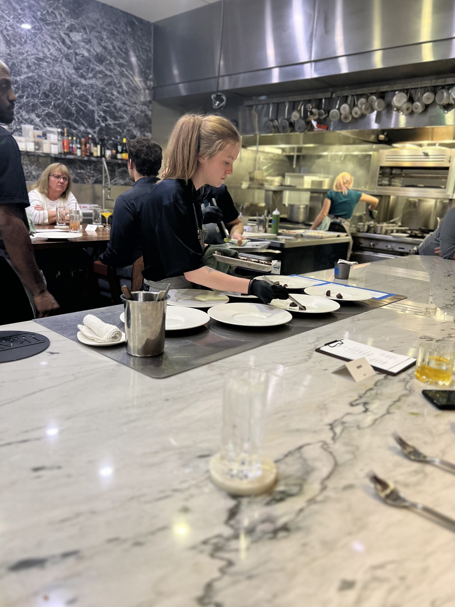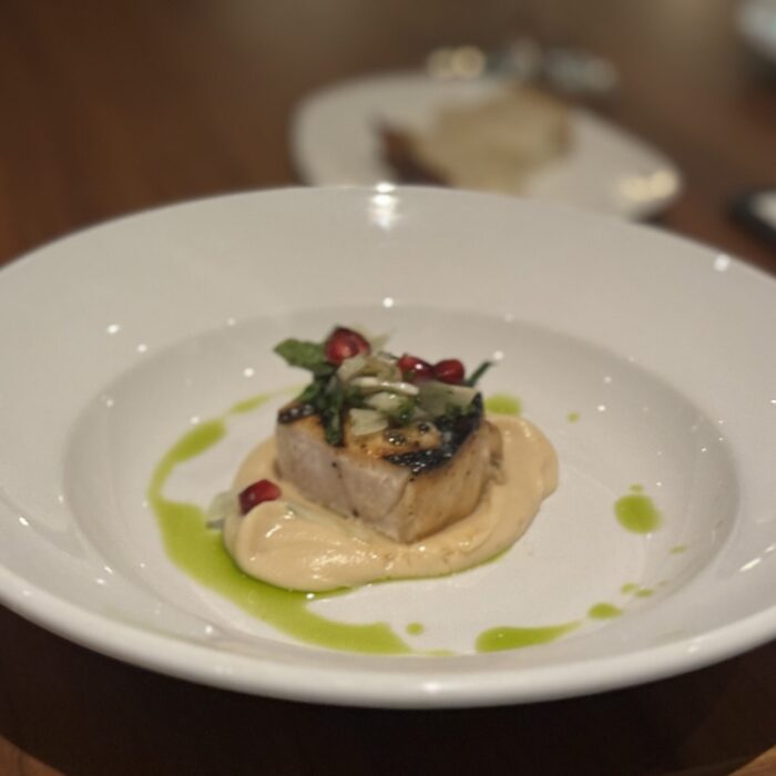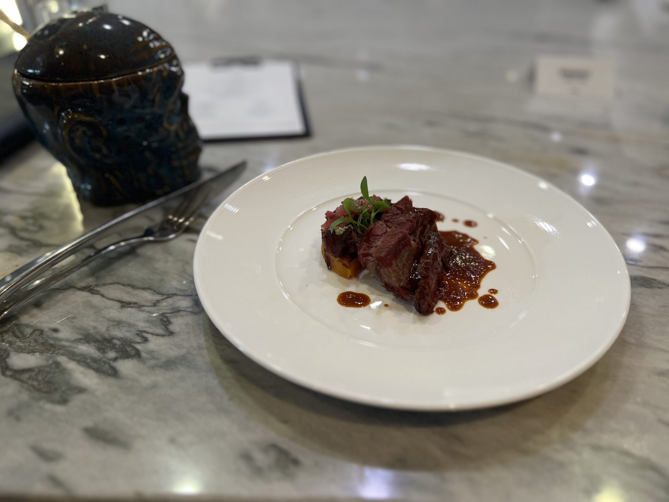 On my first visit, the theme seemed to be art and color. When I arrived, there was a time to mingle about and explore the hors devours, have a mocktail, settle in. There was a color wheel that you spun to determine what kind of coating your foie gras lollypop was dipped into; a Monochromatic bite consisting of only red ingredients (and laid out on a deep red table); a Jackson Pollock event where we were given squeeze bottles of three sauces and a canvas made of square plates, and encouraged to go nuts. I may have gone a little too nuts though, as I def squirted another diner a tiny bit in the face. She was not amused, but I think she just wasn’t in the spirit. I mean, it wasn’t much, and it was on her cheek for god’s sake! I didn’t even hit her in the eye or anything! But I digress… After we sat, the theme continued with dishes like the Texture and Contrast (creamy white parmesan, chewy, earthy shiitake, crisp tater tot) and the Print Making (sauces stenciled onto plates to create a beautiful canvas for pork belly). Was the meal perfect? Absolutely not. The mocktails were all too sweet, the chicken was a bit dry – but what I remember was a wonderful meal that was also entertainment, a meal that delighted all of my senses, a meal that was fun.