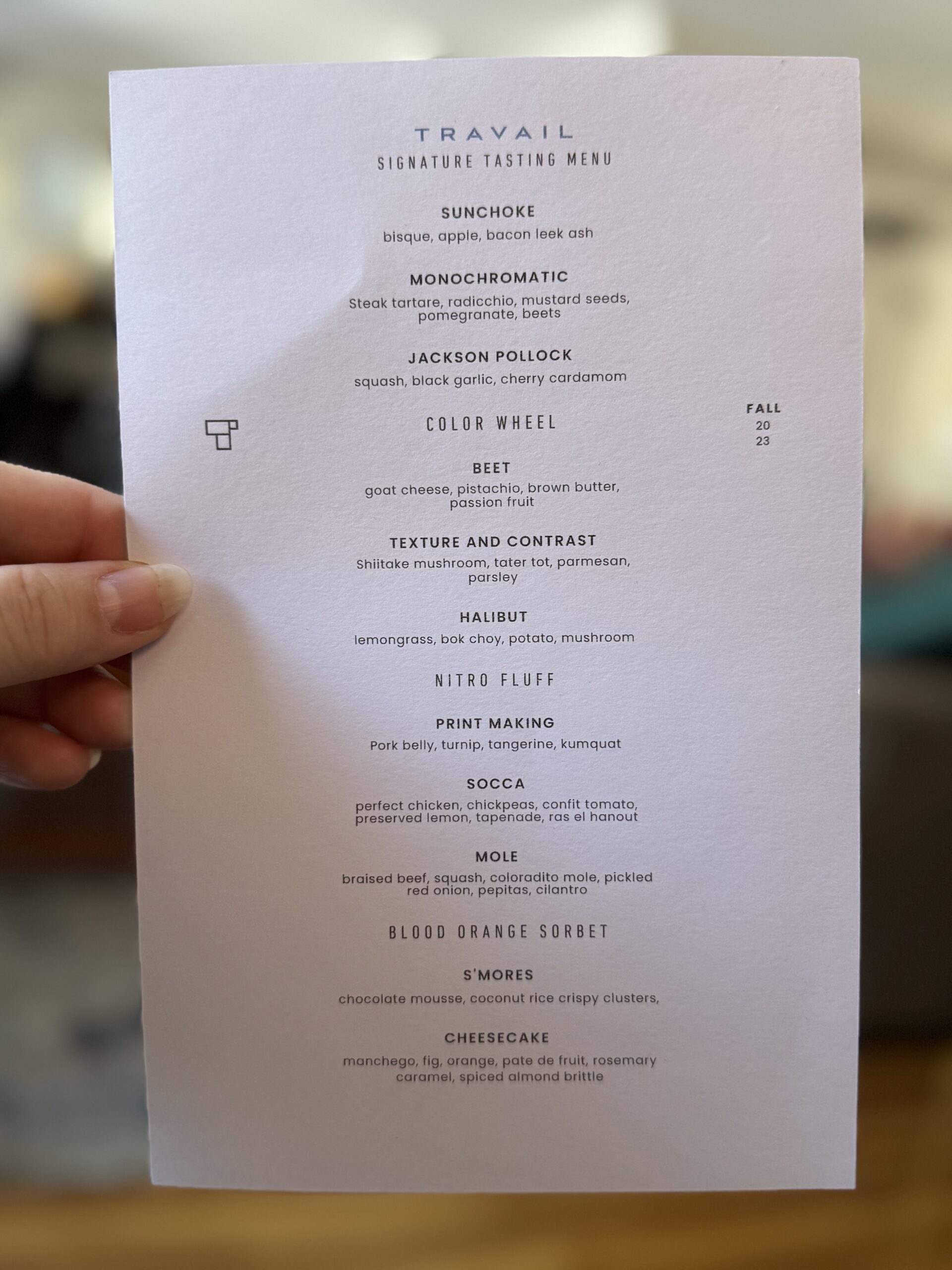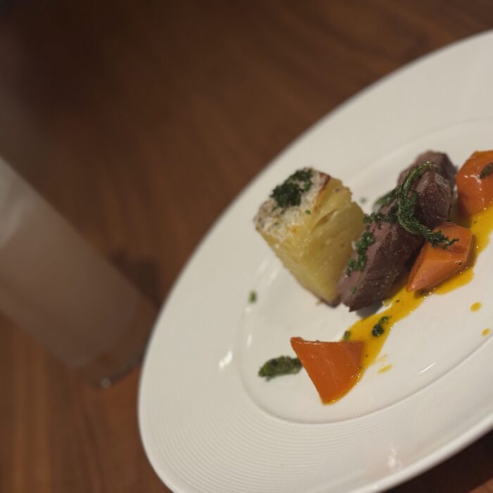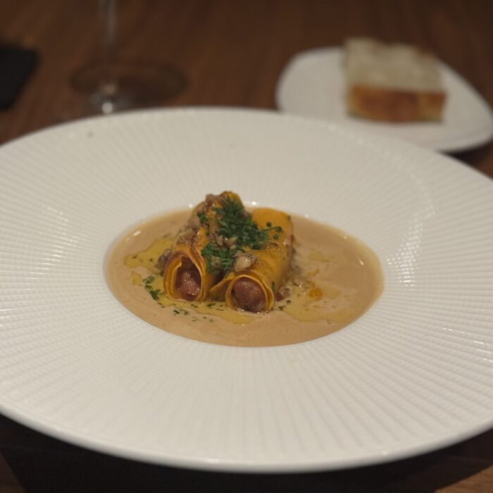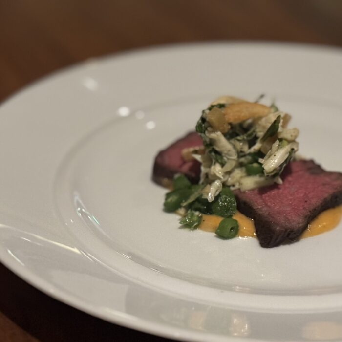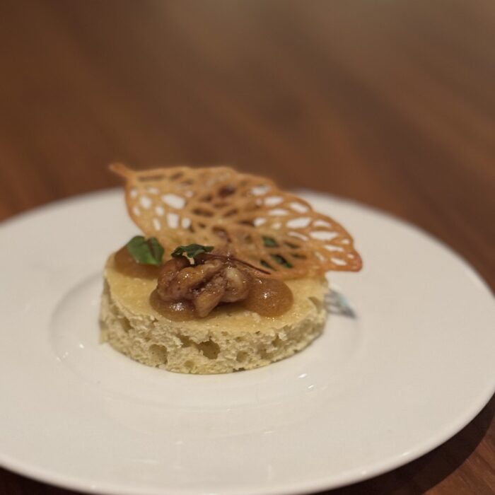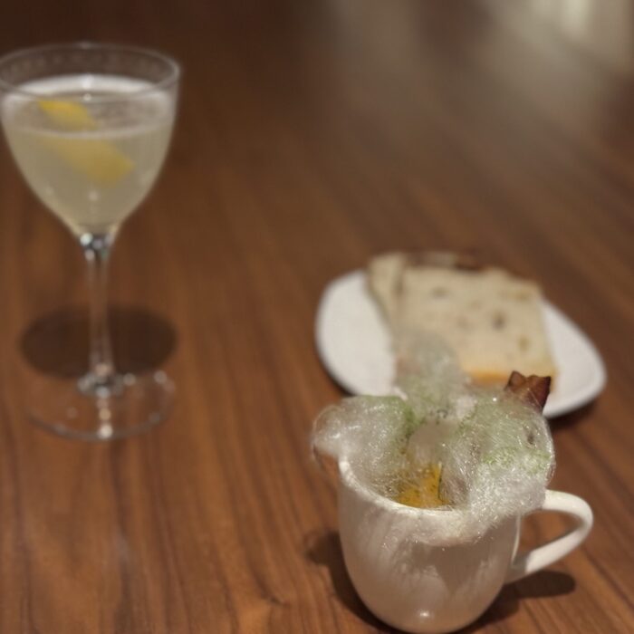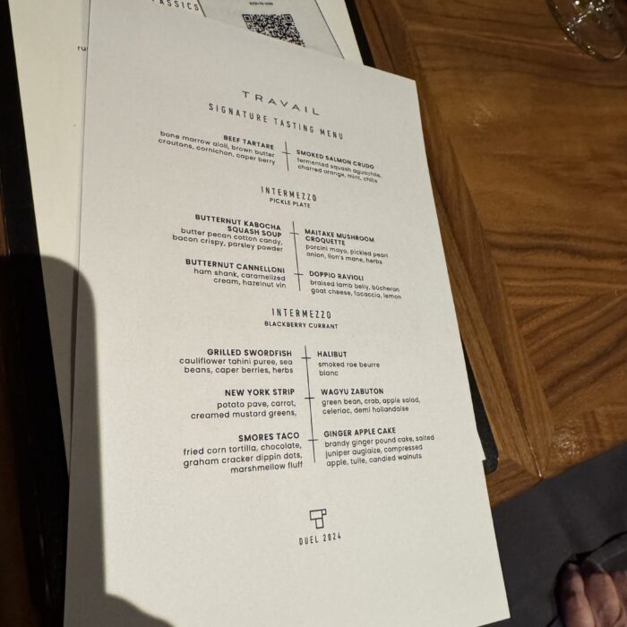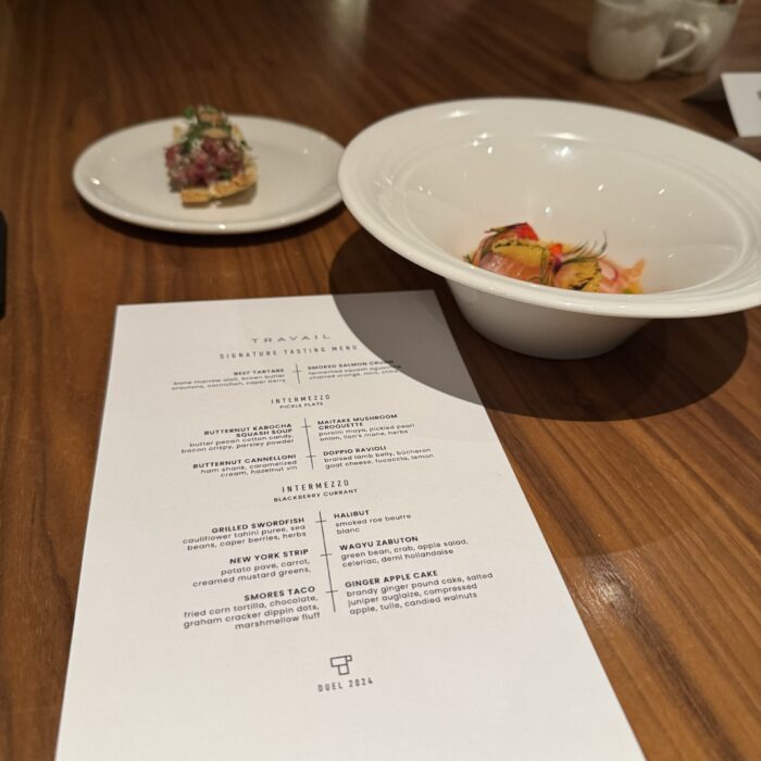 I’ve eaten at Travail twice since moving to the Twin Cities in 2022, and while both meals were playful and fun, they were very different experiences. I suspect that not only does the menu change often at this tasting-menu venue, but also the whole concept of the meal! Between that and the attitude of the staff when I’ve visited, I imagine a lively group of them sitting down together, eating of course (you always eat during restaurant planning sessions, in my experience), devising a whole new theatrical concept for the meal in the coming term, then the designing the menu around that idea or theme. This image I’ve created of the inner workings of Travail as this silly, happy place where they’re really just playing… it almost makes me want to go back to kitchen work (but then I get the almost PTSD reaction that always comes with that thought, and I move on).