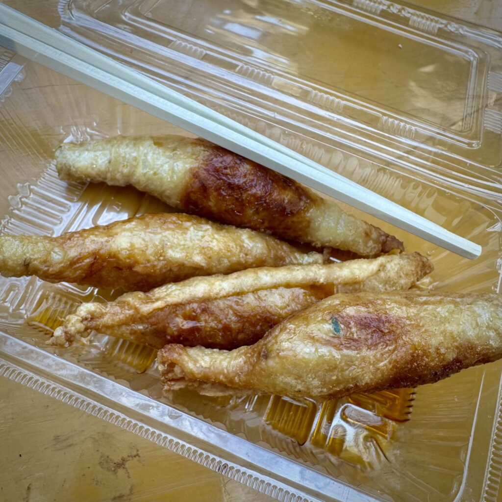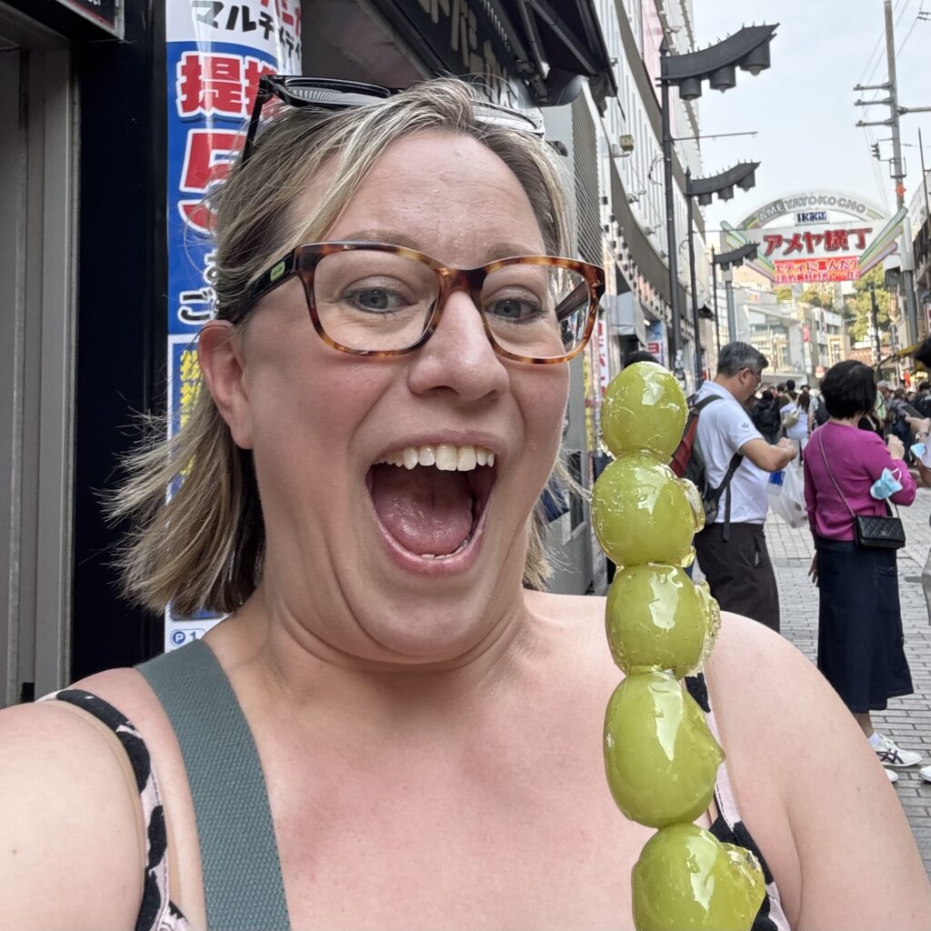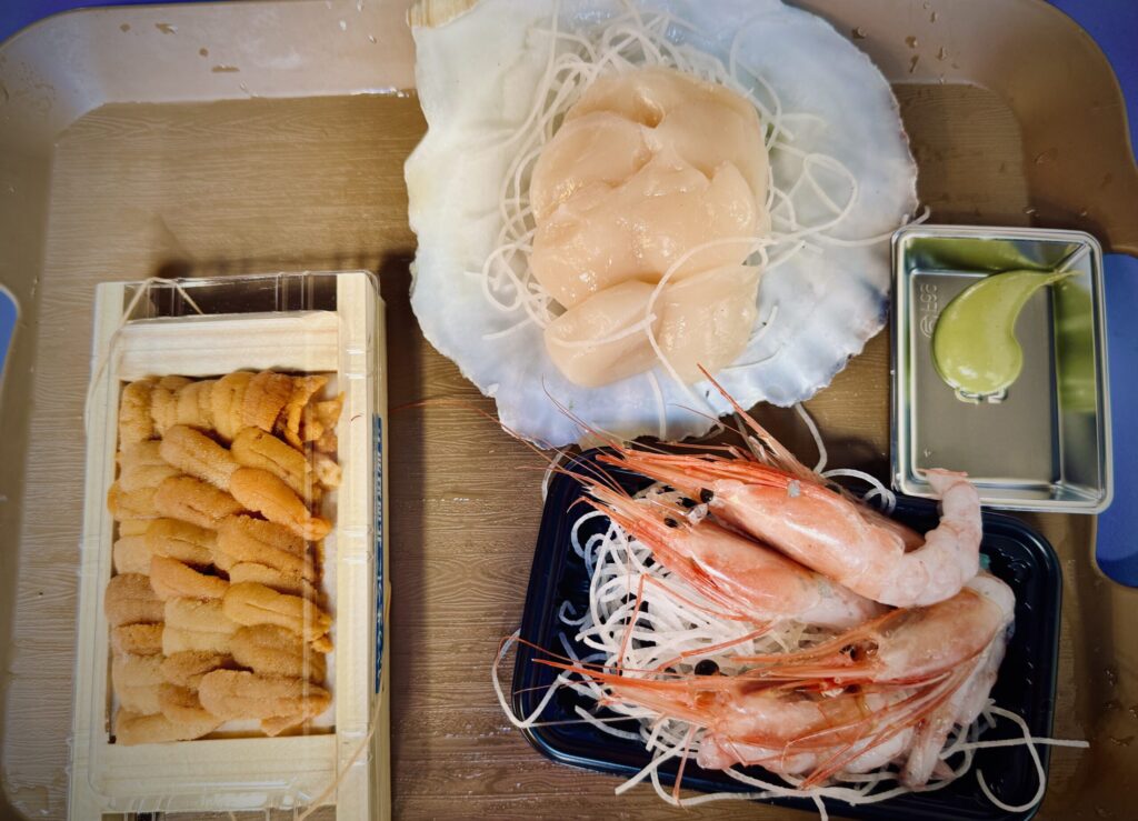 We ate a lot of different things while wandering the market one day, but my favorite from this trip (and my favorite memory from my last trip, in 2018) is the nonsensically sized trays of uni you can get for practically nothing. I mean, I literally spent 500 Yen (less than $4) for some 30 pieces of sea urchin. At a sushi restaurant in the states, you’re doing really well if you pay that for one piece. And just to have that much of this delectable delicacy in one sitting? It blows my little brains out! So yes, the scallops, both raw and cooked, and wagyu skewers, and insane little strawberries were all fabulous, but nothing will ever thrill me so much as that giant box of uni.