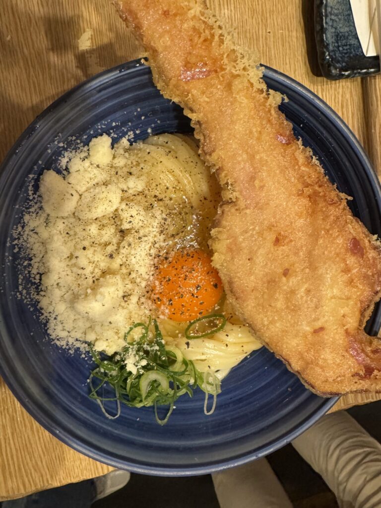 I preferred the warm udon. My first trip I had the carbonara – raw egg, Parmesan cheese, black pepper, butter, and the best idea ever, tempura bacon. Mind blowingly good. So rich and deep, but not so much that you get flavor fatigued. I went a little more classic when we returned, forgoing the cheese and bacon for cod roe and green onions and soy sauce. But again it was a perfect combination, hitting all the flavor and texture notes to produce a freakin symphony of delight. Combined with the perfect tempura we started with, and the sparkling cider that I miss to this day, these were easily my favorite meals from our entire time in Tokyo.