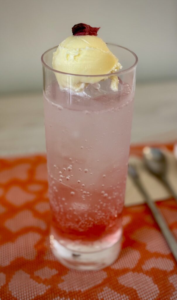 To gild the lily, as it were, I paired this with a Sakura Cream Soda, which was not what I expected it to be! In my mind, I had decided that a Japanese cream soda was something like an Italian cream soda, a sparkling beverage with a flavored syrup and cream. Wrong! It’s an ice cream float! So maybe a little bit right if I left it alone till the ice cream melted? Either way, it was dessert on top of dessert, and I loved it. The cherry blossom flavor of the soda was floral and not too sweet, which was perfect with the ice cream melting into it and the parfait on the side.