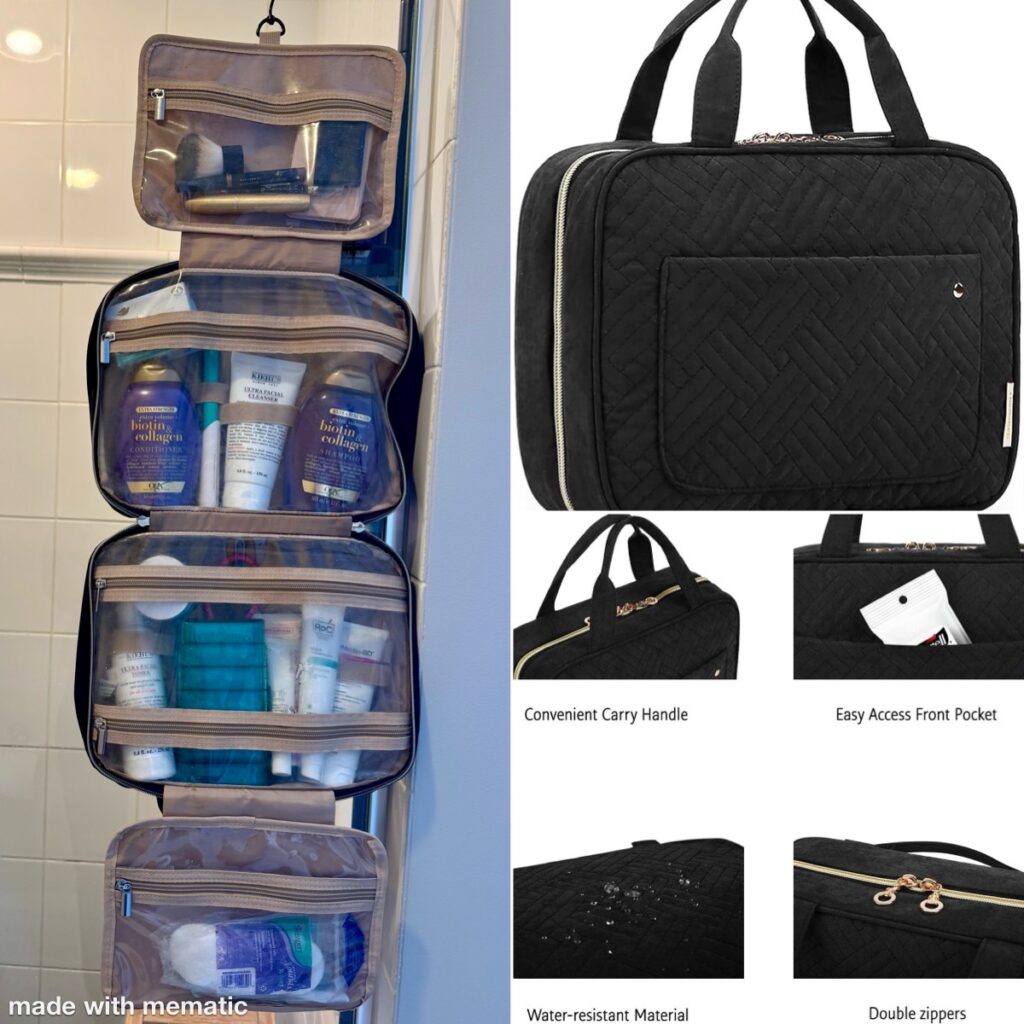 Plenty of compartments, enough space for full-size products if you want them, and everything stays in one place—no scattering your skincare across the bathroom counter or digging through multiple bags. For the right trip, this is my MVP.